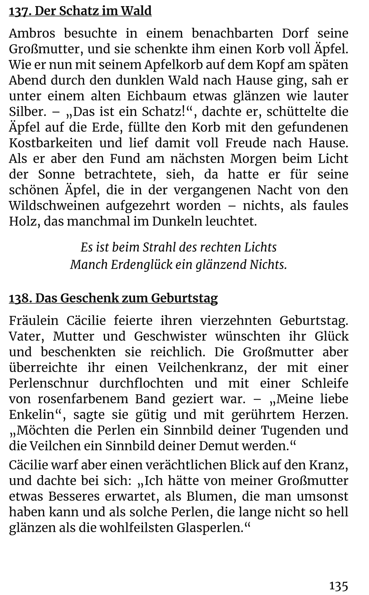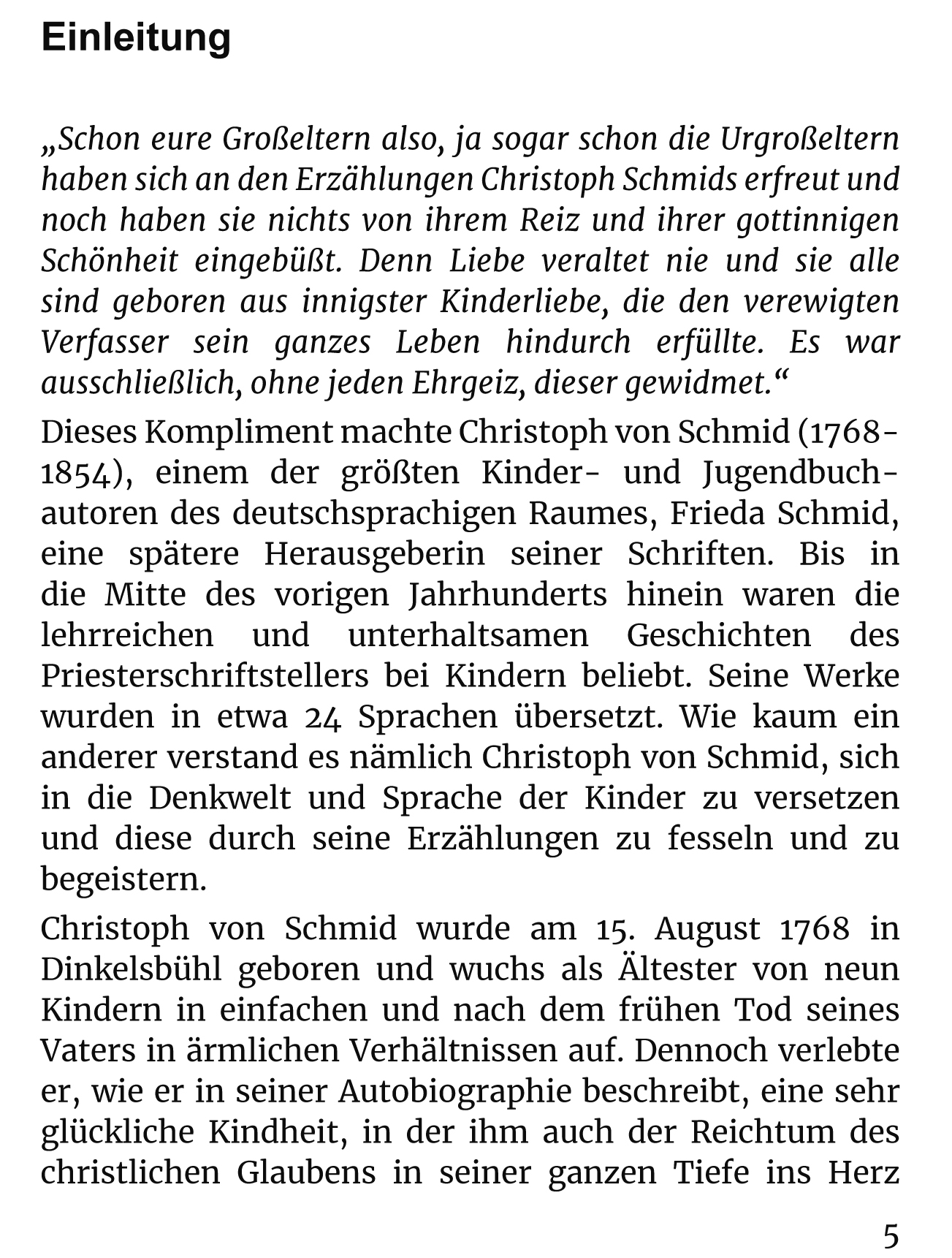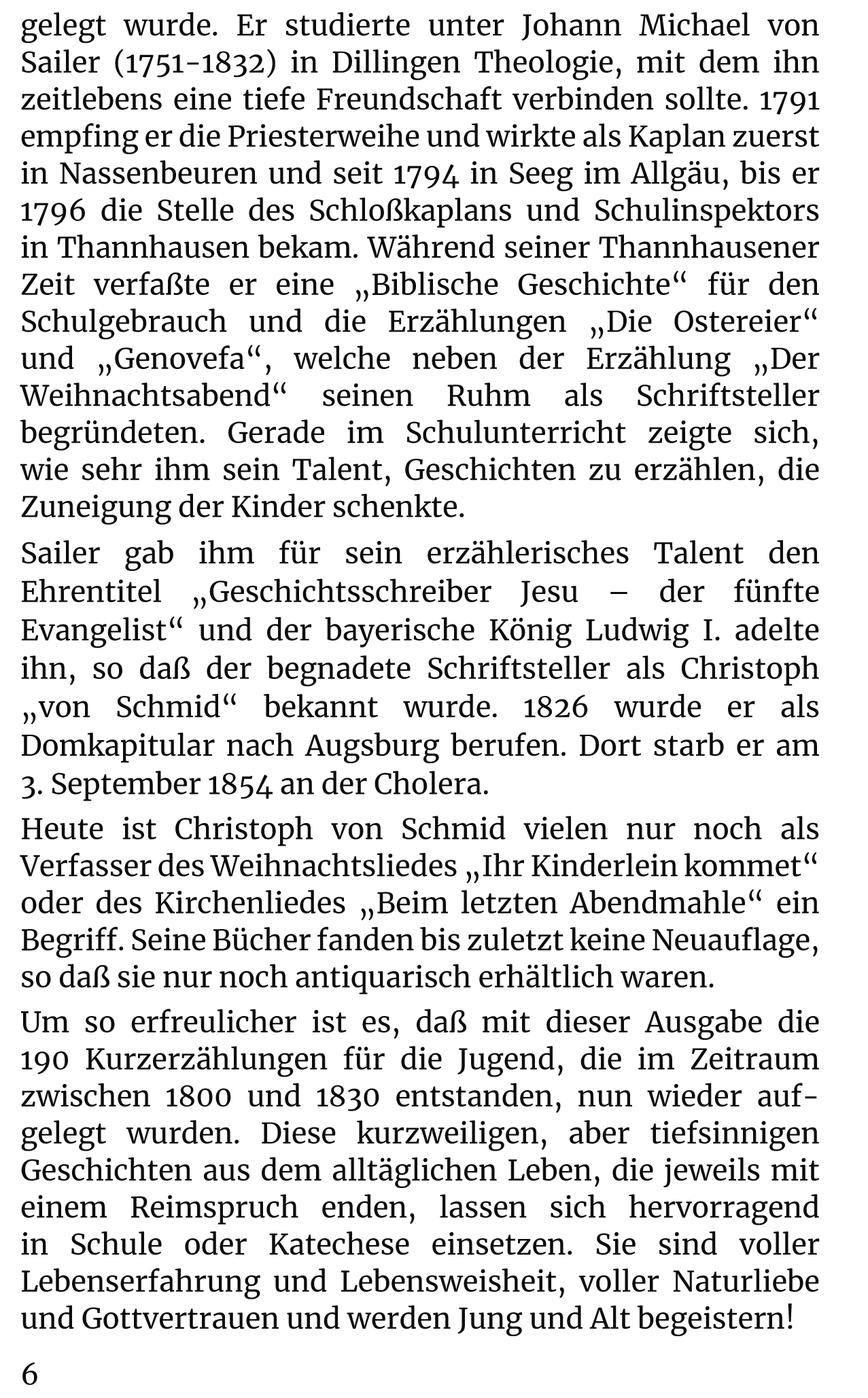 Christoph von Schmid war lange einer der gefeiertsten Kinder- und Jugendschriftsteller Deutschlands. Sein verehrter Lehrer, Bischof Johann Michael von Sailer, gab ihm einst den Ehrentitel „Geschichtsschreiber Jesu – der fünfte Evangelist“. In seinen längeren oder kürzeren Erzählungen gelingt es ihm immer wieder, die Herzen der Leser zu berühren. Hier nun erscheinen seine „190 Erzählungen für die Jugend“ neu. Dies sind kurze, lehrreiche und teils lustige Geschichten aus dem Lebensalltag der Kinder, die allesamt mit einem Reimvers enden. Mögen sie auch heute noch Kinder erfreuen!